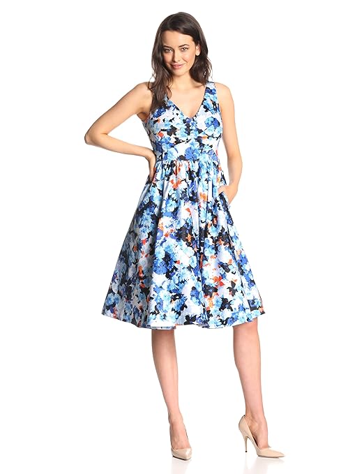 Nice sleeveless floral dress from Donna Morgan. With V-neck and full skirt with pockets it is another good choice for a wedding or official party.
