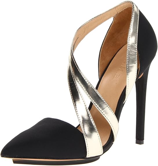 Elegant pumps from Gwen Stefani (L.A.M.B). A metallic, asymmetric strap swoops across this sleek, pointed-toe platform.
